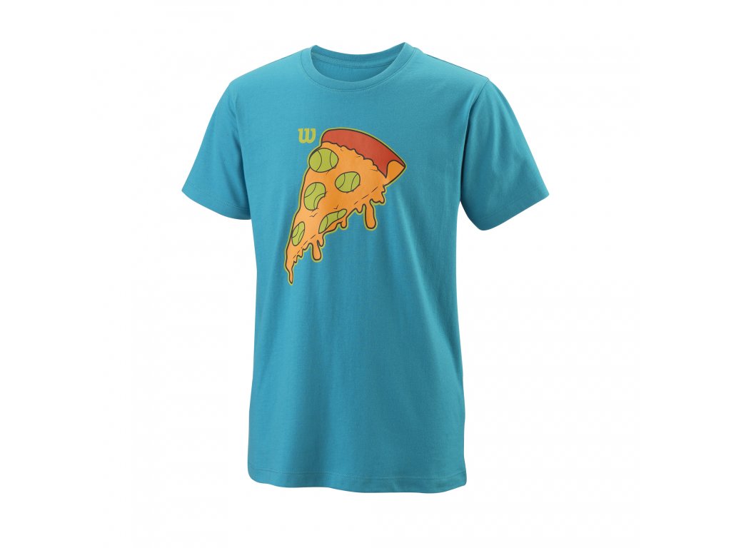 Chlapecké tričko Wilson Slice Tech s velkým obrázkem kousku pizzy a míčky pro hravé letní dny na kurtu.