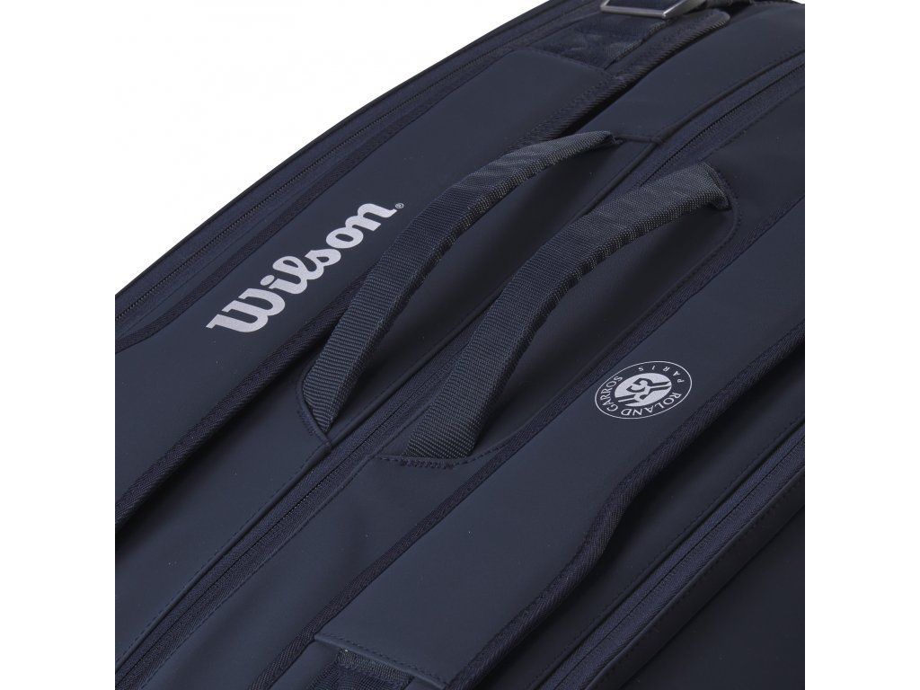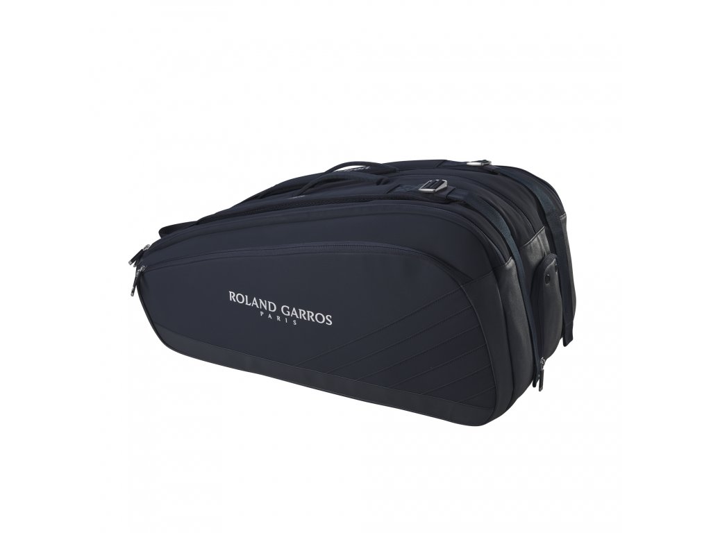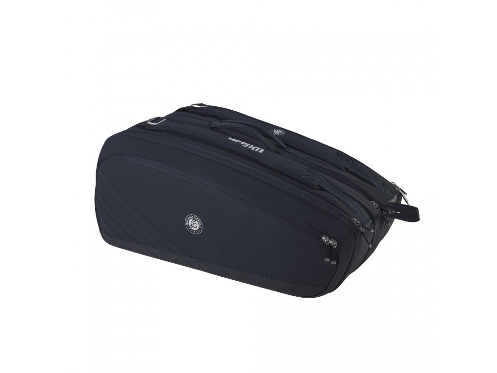 Taška na rakety Wilson Roland Garros Super Tour 15 PK v černé barevné kombinaci byla inspirována večerní show na tenisovém turnaji Roland Garros.